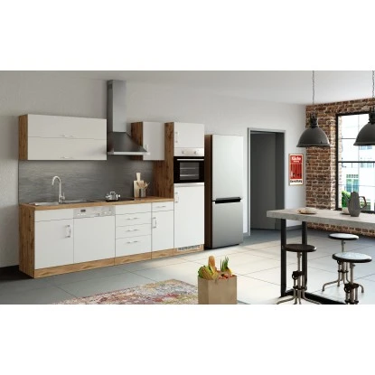 Die Küchenzeile wird Ihnen zerlegt und ohne Dekoration geliefert. Die Anordnung der Küchenelemente und die Anschläge der Türen sind somit für Sie frei wählbar. Die Arbeitsplatte wird ohne Ausschnitte geliefert. Technische Änderungen und Irrtümer vorbehalten