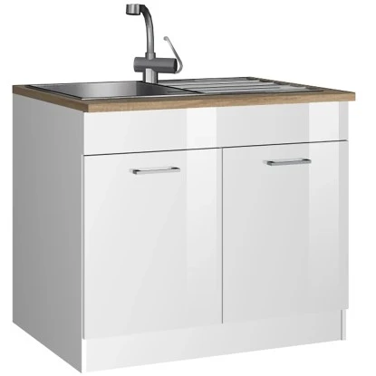 Der Spülenunterschrank von Held Möbel aus der Serie Mailand zeichnet sich durch seine hochglänzende MDF-Front, attraktivem Metallgriff sowie der pflegeleichten Korpus-Kunststoffoberfläche aus. Der Schrank innen ist in Weiß gehalten. Zusätzlich findet sich hier eine 28 mm starke Arbeitsplatte im Eiche Dekor ohne Ausschnitt für einen variablen Einsatz der Spüle.