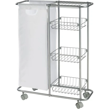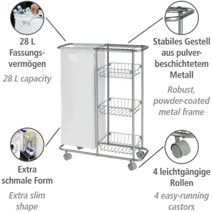 Durch die extraschlanke Form passt der Sammelwagen auch in kleine Lücken. In der Waschküche macht der Sammelwagen ebenfalls eine gute Figur. Auf den Ablageflächen können Waschmittel und Waschhelfer aufbewahrt werden und sind immer griffbereit. Der abtrennbare Sack ist ideal als Wäschesammler geeignet.
